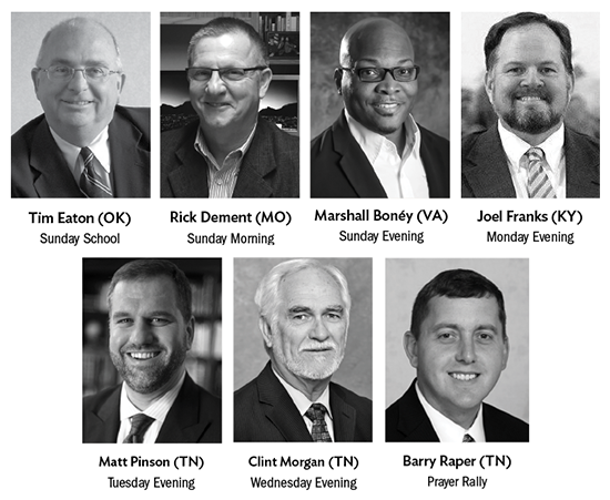 Speakers Tim Eaton (OK), Rick Dement (MO), Marshall Bonéy (VA), Joel Franks (KY), Matt Pinson (TN), and Clint Morgan (TN) will address the theme, Equipping the Saints from Ephesians 4:11-12. Online streaming of convention services will be provided at www.nafwb.org for those who cannot attend, courtesy of the Free Will Baptist Media Commission. The theme will also be emphasized by a prayer rally on Tuesday morning, guided by Barry Raper (TN).