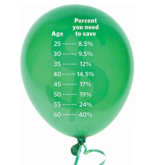 Obviously the younger you start saving, the smaller the percentage of your income you need to save, so start squeezing the balloon as soon as you can!