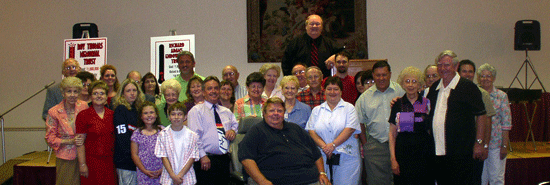 Pictured above: Members of the East Side FWB Church (pastored by Brother Adams pastored for 20 years before his employment at the Home Missions Department) in Elizabethton, Tennessee, gave $100,000 to the trust during the month of May. Don and Willene Wilson contributed $50,000. Sandy Carr, former preacher pal of Richard Adams, gave the final $32,000 to complete the campaign. These men and women have been friends to Richard and Carolyn for more than 36 years and have traveled with them extensively. They enjoy supporting the work of Home Missions.