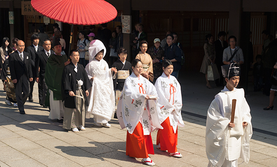 Traditionally, Japanese weddings are Shinto. Immediate family and a select number of guests attend the ceremony held at the Shinto shrine. In a traditional Shinto wedding (pictured below), the bride is painted white and wears a white wedding kimono. The groom wears a formal black and grey kimono. The groom, bride, and both sets of parents drink sake (rice wine) in three sips to represent the unity of the couple and their families. This takes the place of vows.