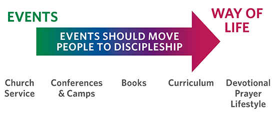 Remember, discipleship is not an event; it’s a way of life. Events provide vitally important onramps to inspire and challenge people to live out their faith in daily discipleship. Events are momentary, but lifestyles are sustainable habits. Discipleship by its name includes discipline; consistently living as a disciple daily, not once a week. Events describe an occurrence with a defined starting and ending point such as a weekly church service, annual conferences, youth camps, or even a class that might offer a slightly longer event.