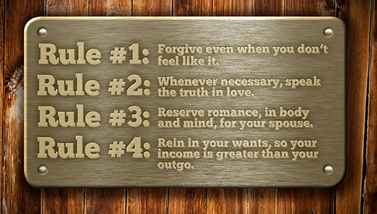 Finally, Rule #4 keeps George, Abraham, Ben, and your marriage in proper order. If infidelity is the fast track to divorce, financial folly is the slow lane to the same destination. When watching commercials on TV or walking through the mall, tell yourself a thousand times, “I don’t need that.” It’s the truth most of the time. You really don’t need it. Contentment goes a long way toward giving you a good night’s sleep. Husbands and wives usually thrive if Rule #4 is well observed.