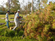 Above: (left) Volunteers clear debris in the Gulfport community; (right) The Master's Men Disaster Relief Unit sits in front of the Gulf Coast FWB Church