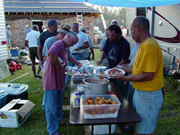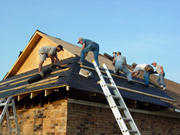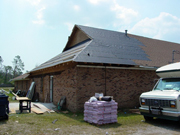Above: (left) Volunteers cover the repaired roof with tar paper; (right) Breaking for supper