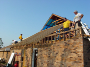 Above: (left) A break in the work for prayer; (right) The roof awaiting inspection and shingles.