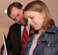 Photo: President Pinson looks at a college yearbook with a student.