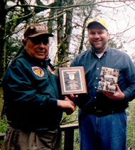 Photo Identification: Lawnie Coffman (L) receives plaque from FWBBC president Matt Pinson who holds DVD collection. Arkansas executive director Tim Campbell joined them at Coffman’s cabin.