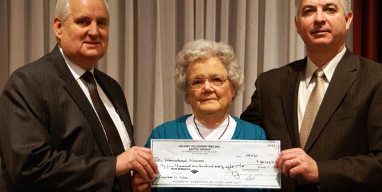 Fenton, MO—In a service on February 3, Calvary Fellowship Missions Chair Mrs. Delsie Troutman and Pastor Jerry Norris presented a check for $35, 168.01 to Barry Simpson, the Mission’s director of development. The money is designated for building churches in India. Jerry Norris also serves on the Board of FWBIM.