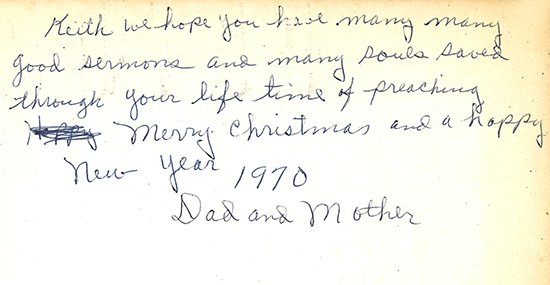 But perhaps the thing that made that Christmas gift most special was the handwritten message on the front flyleaf. It read, “Keith, we hope you have many, many good sermons and many souls saved through your lifetime of preaching. Merry Christmas and a Happy New Year 1970—Dad and Mother.”