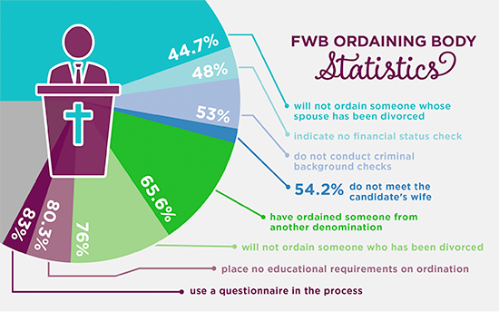 Interestingly, a majority (54.2%) of ordaining bodies do not meet (or are unlikely to meet) the candidate’s wife during the ordination process. And only 10.6% of ordaining bodies have a policy that requires meeting the candidate’s wife. Yet, a strong majority (76%) will not ordain someone who has been divorced, and 44.7% will not ordain anyone whose spouse has been divorced.
