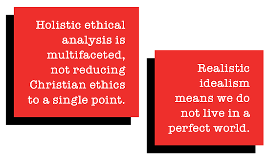 Significantly, to pursue a fully Christian ethic, we must engage the issues holistically to avoid isolating any one element from the others. Mere appeal to conduct, character, or consequence reveals an ethic of strict deontology, individualism, or consequentialism, respectively. In contrast, Christian ethical analysis balances all three elements.