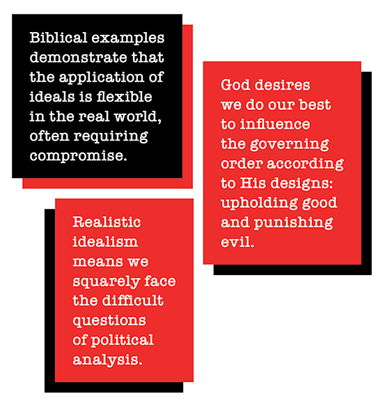 Consequently, we should be unsurprised by the phenomenon of compromise in politics. The accounts of Joseph, Daniel, Ezra, and Nehemiah present people who clearly recognized the flexible nature of actualizing ideals in a broken world. Additionally, they worked with deeply unsavory characters—womanizers, idolaters, and the like. Undoubtedly, they preferred a better set of circumstances (not exile), but they did not live in that world. Biblical examples demonstrate the application of ideals is flexible in the real world, often requiring compromise.