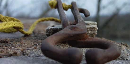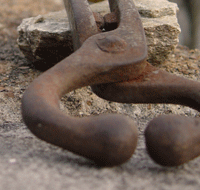 Are you curious about the picture? When the orbs are placed in the muzzle of an animal, and a lead is tied through the circles at the other end, wrapped around the arms, and into the hook, an effective lead is provided. Even the largest of animals could be easily led. That’s why the item in the picture is called a “come-along.”