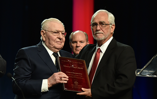 Morgan presented plaques to board member Tom McCullough and outgoing board Chairman Danny Williams for their years of dedicated ministry. He honored missionary Mirial Gainer for 40 years of work in Japan and presented a plaque to Carlisle Hanna (pictured above, left, with Clint Morgan) longest-tenured IM missionary, for 65 years of service to God and India.