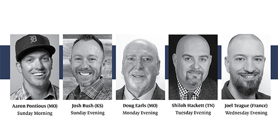 Sunday morning, during a joint service with teens and adults, representatives from Truth & Peace Student Leadership Conference will teach the Sunday School lesson before Aaron Pontious (MO) explores the commands to build, plant, and seek peace when you find yourself in a world turned upside down (Jeremiah 29:4-7). Sunday evening, Josh Bush (KS) will challenge listeners to accept the mission when God calls (Jonah 1). Monday, Doug Earls (MO) will offer the warning that disobeying God's call will sink you (Jonah 2). Tuesday, Shiloh Hackett (TN) will encourage the reluctant to say yes to God's call (Jonah 3). Wednesday, following the commissioning service for new church planters and missionaries, missionary Joel Teague (France) will challenge every believer to answer the call to love people like God loves them.