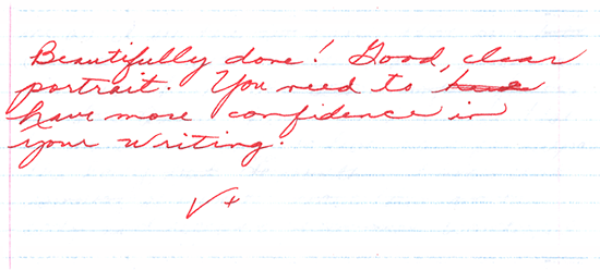 And words hold such power. I will never forget the simple lines expressed by my high school English teacher. After grading the first essay of my junior year, he wrote simply: “Beautifully done! Good clean portrait. You need to have more confidence in your writing.”
