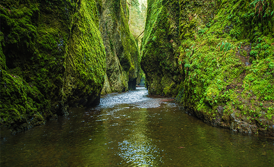 It was. When I splashed out of the deep water and rounded the first bend of the gorge, I gasped in amazement. Sheer, moss-covered walls rose hundreds of feet on either side of a canyon so narrow I could reach out and touch both sides. Enormous ferns and towering spruce trees cast eerie shadows through the dim, filtered light. I couldn’t help but feel as though I had been transported magically into a scene from Jurassic Park.