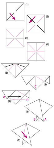 Fold a square piece of paper in half diagonally so you have a triangle; then unfold the paper (1).