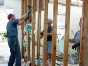 Above: (left) Volunteers remove damaged sheetrock inside the church; (right) Repairs begin on damaged church roof