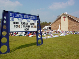 Other FWB relief efforts also report progress. Bro. Benny Hartley from North Carolina has accomplished tremendous ministry in Bay St. Louis, a town west of Gulfport that was even closer to the eye of the storm. His crew has made a significant impact on the people of that community. Along with serving three hot meals a day, they have fed souls and nourished spirits. Their relief work may be being taken over by a larger group, but the efforts of their labor have yielded eternal fruit.
