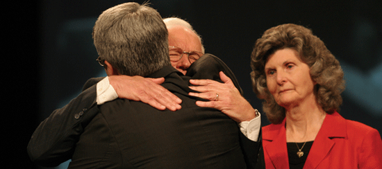 Photo: Retired missionary Bobby Aycock embraces International Missions Director James Forlines after being honored for 40-plus years of faithful service in Brazil.