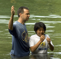 A Sunday morning pancake breakfast was followed by an outdoor worship service. Lake Toya served as a baptismal pool on Sunday afternoon. Mika Sasaki (right), a young career lady, and Fuma Tokiwa (left), a junior high boy who grew up in the church, gave their testimonies. After singing, congregants rejoiced together as the two believers made a bold profession of faith through baptism.