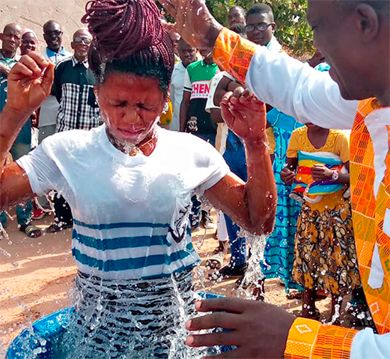 Côte d’Ivoire—On Sunday, February 13, Pastors Edmond and Laurent held a communion service and baptized nine young people in the Tchafrité FWB Church in Ivory Coast. Due to a drought, the baptisms were held in 55-gallon barrels (below).