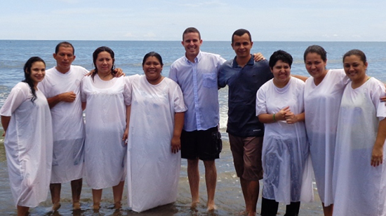 Las Tablas, Panama—Pastor Efraín González, a 2013 graduate of the Chame seminary, invited Lázaro Riesgo to baptize seven new believers at Los Santos on Sunday, September 21. Los Santos, one of the central provinces of Panama, has deeply-rooted Roman Catholic traditions. Efraín pastors in Las Tablas, the capital of the province, some 130 miles from the Bible institute.