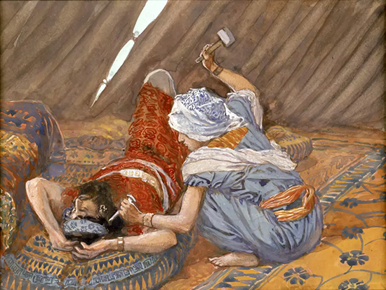 She nods. He snores. Jael eases out the tent flap, pulls a peg from its anchoring place, takes a mallet in her right hand, and goes to him softly.